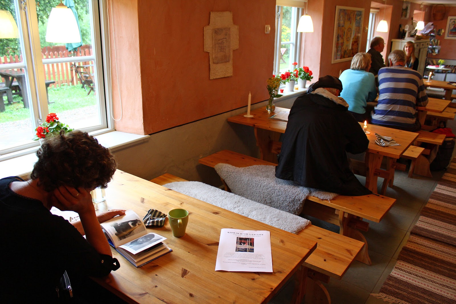 Hjärtat av vår verksamhet. Hit kommer pilgrimer, turister, lokalbefolkning för att mötas och koppla av. Här letar du inte efter "lediga" bord utan bord som redan är befolkade. I vårt café hittar ni frukost och fika för en billig peng. Hos oss kan ni också få med er en matsäck för er vandring. Om ni är en större grupp (fler än 8 personer) önskar vi att ni förbeställer fika och/eller vandringsmatsäck senast en vecka innan ankomst.