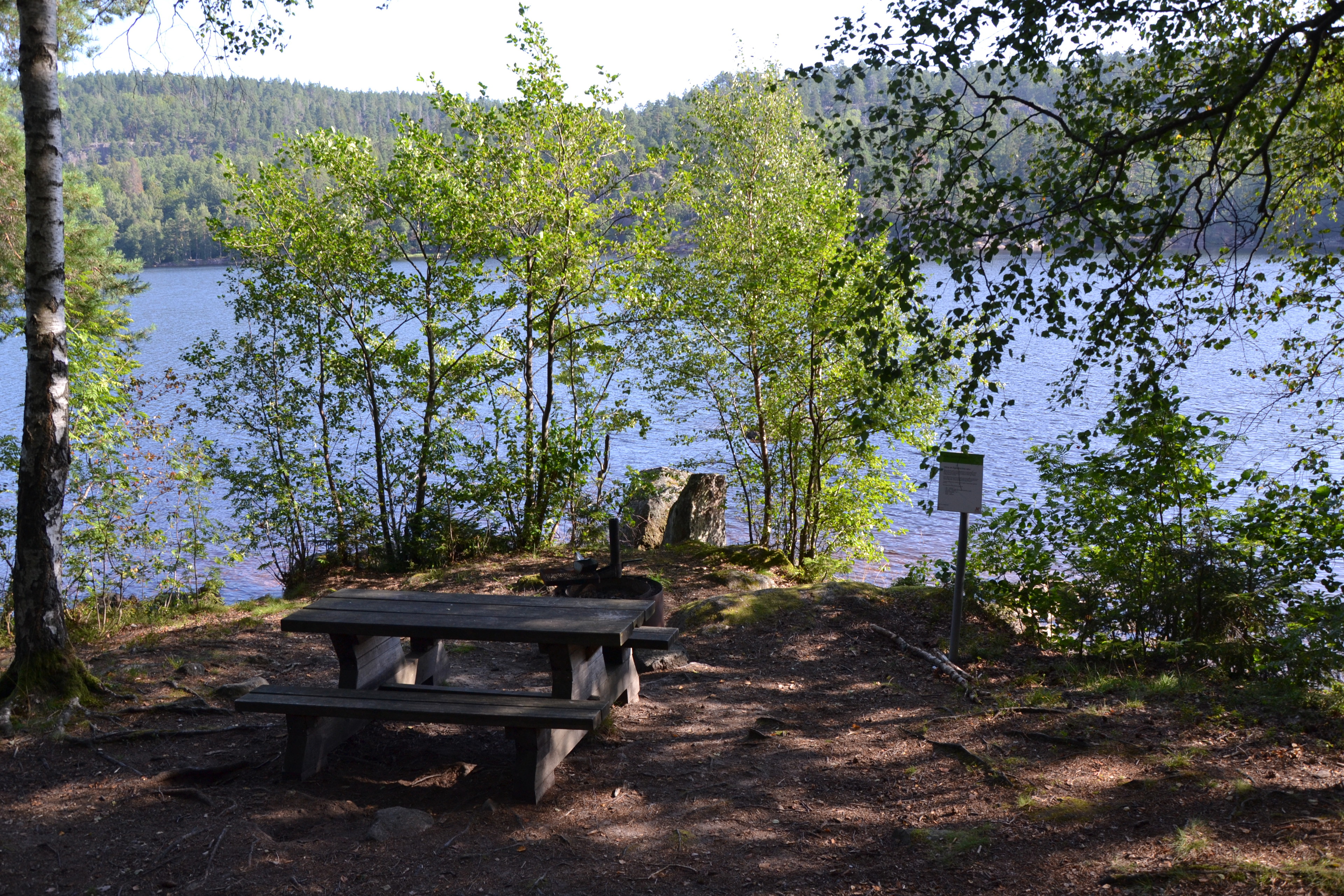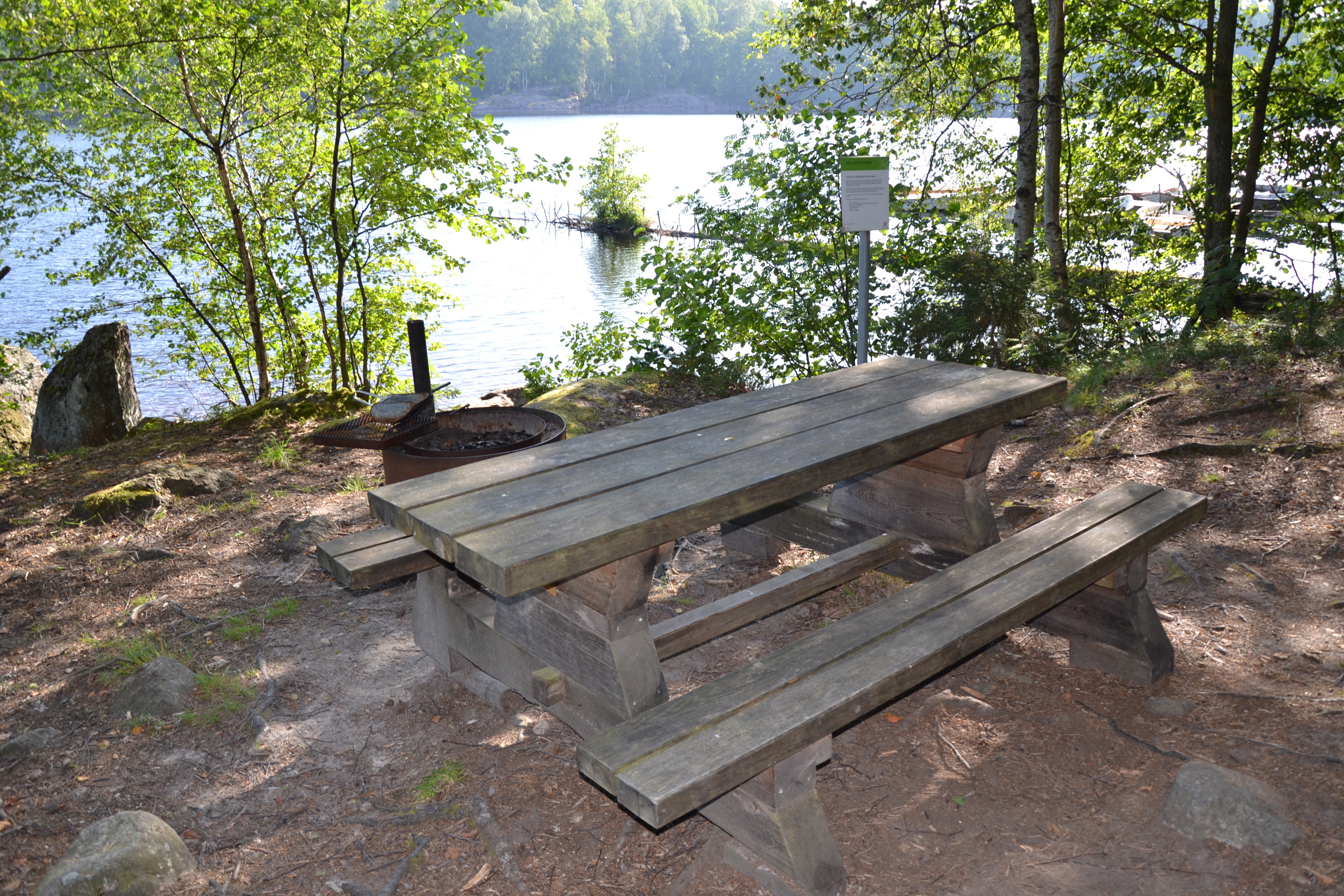 Rastplats med bänkbord och grill, alldeles intill vattnet och med skugga från de omgivande träden.